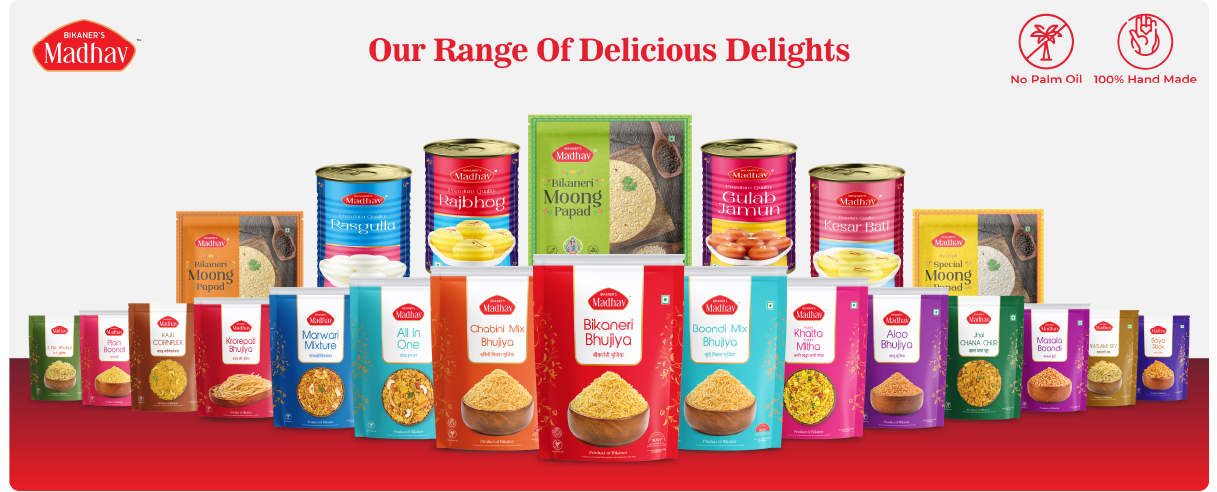 Whether you’re craving the rich and spicy Bikaneri Bhujia or a variety of savory Bikaneri Namkeen, we have something to satisfy every palate. Our commitment to quality and authenticity has made us a trusted name in the industry. We are proud to be known as Madhav Namkeen, Bikaner’s Madhav, or Bikaner’s Madhav.