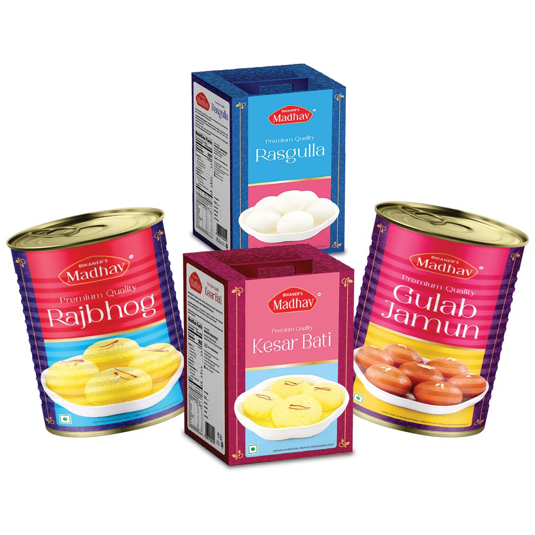 • 4-in-1 Royal Mithai Combo: Includes Gulab Jamun, Rajbhog, Rasgulla, and Kesar Bati – 1kg each